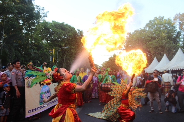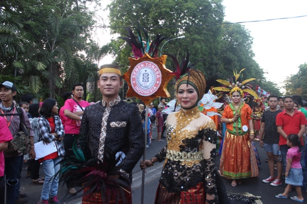 Para peserta yang mengenakan berbagai macam pakaian unik memulai langkahnya dari Monumen Mandala menuju Rumah Jabatan Gubernur dengan penampilan yang menarik sehingga membuat para undangan dan penonton terpukau melihatnya.